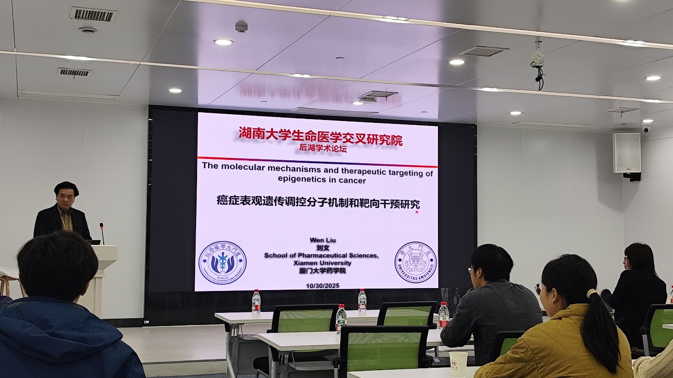 10月30日上午,国家基金委杰出青年基金获得者、厦门大学药学院院长、福建省药物新靶点研究重点实验室主任刘文教授做客后湖学术论坛,与创新楼211报告厅作“癌症表观遗传调控分子机制和靶向干预研究”主题报告。
